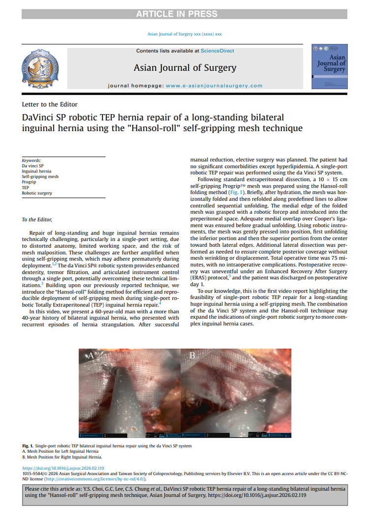 대장항문외과 이철승 부원장, 교신저자 대장항문외과 최영선 진료과장, 제1저자 DaVinci SP robotic TEP hernia repair of a long-standing bilateral inguinal hernia using the "Hansol-roll" self-gripping mesh technique (2026-02-27) “40년 이상 지속된 교액성 양쪽탈장 환자에서 다빈치 SP 단일공 로봇 수술을 통한 자가고정 메쉬 수술 세계 최초 보고” 학술지: Asian Journal of Surgery Available online 27 February 2026. doi: https://doi.org/10.1016/j.asjsur.2026.02.119 |