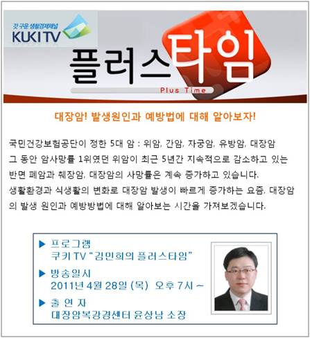 대장암복강경센터 윤상남 소장이 쿠키 TV 플러스타임에 출연하였습니다. "대장암의 원인과 예방법"이란 주제로 4월 28일 (목) 오후 7시에 방송될 예정이오니, 많은 시청 바랍니다.고맙습니다.