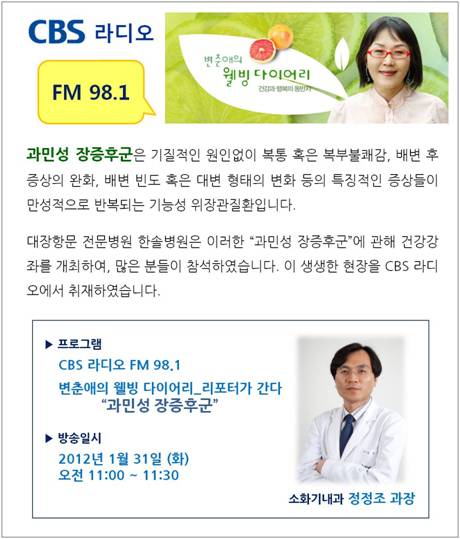 소화기내과 정정조 과장이 CBS 라디오를 통해 "과민성 장증후군"에 대해 소개합니다. 많은 청취바랍니다. 고맙습니다.