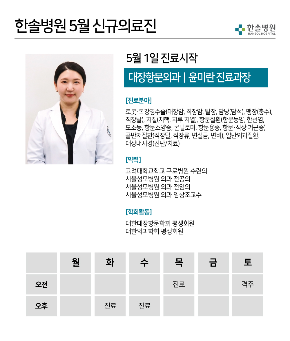 2026년 5월 1일부터 대장항문외과 윤미란 진료과장, 영상의학과 이윤철 진료과장이 진료를 시작합니다.