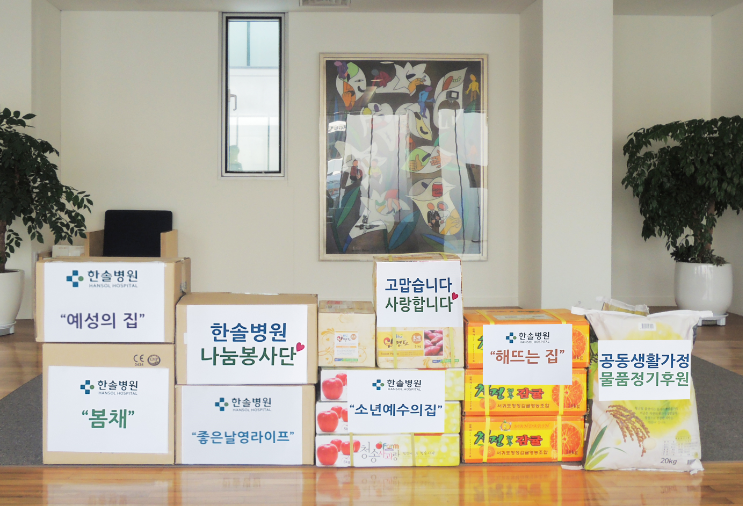 올해의 나눔은 해뜨는 집, 소년예수의 집, 좋은날영 라이프, 별빛내리는 마을, 봄채, 예성의 집 등에 과일, 세탁세제, 섬유유연제, 쌀, 간식 등 다양한 생활필수품을 전달했습니다. 한솔병원은 '병원은 단순히 병을 치료하는 곳'이 아니라고 생각합니다. 지역사회와 함께 호흡하며, 사랑나눔을 실천하는 곳으로 거듭나기 위해 오늘도 최선을 다하겠습니다. 한솔병원은 언제나 사랑입니다. |
