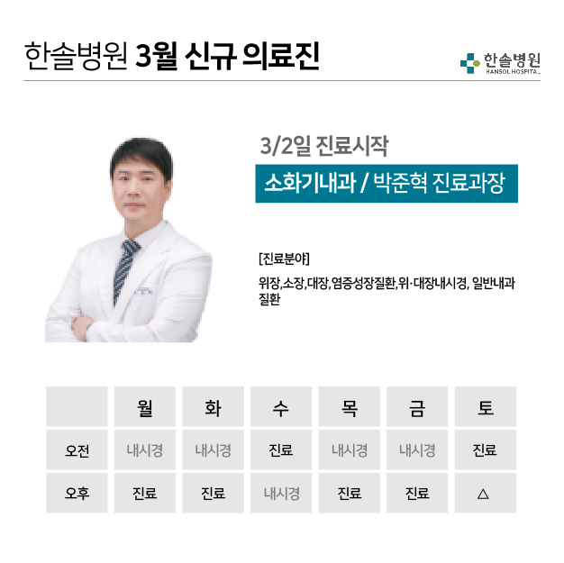 2021년 3월 2일부터 한솔병원 소화기내과 박준혁 과장이 진료를 시작합니다.